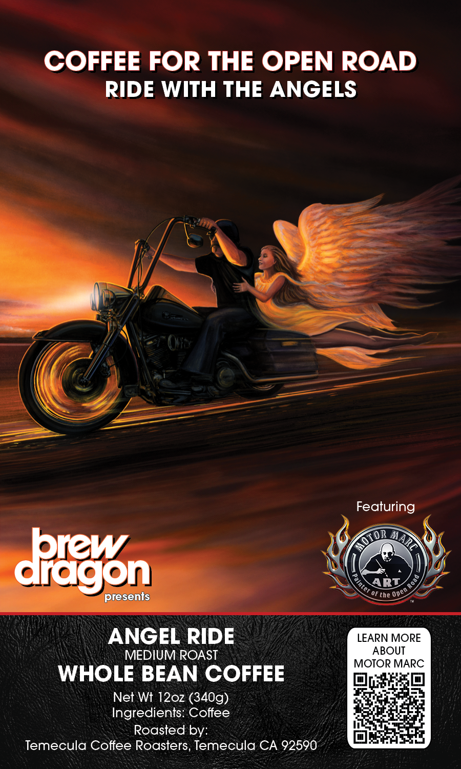 But Angel Ride medium roast coffee isn't just about taste; it's a journey of the senses. Our coffee features an exclusive collaboration with world-famous artist Motor Marc Lacourciere. Marc's "Angel Ride" artwork, the second in his new series of sunset fine art, adorns our label. As described on Marc's website, it depicts a guardian angel guiding a lost rider. Bright stripes of light pierce the dark sky, illuminating the heavenly path of his new journey.